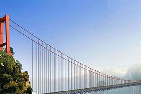 黃登水電站庫(kù)區(qū)小格拉吊橋橋梁主跨280m,橋型為加勁梁懸索橋。...